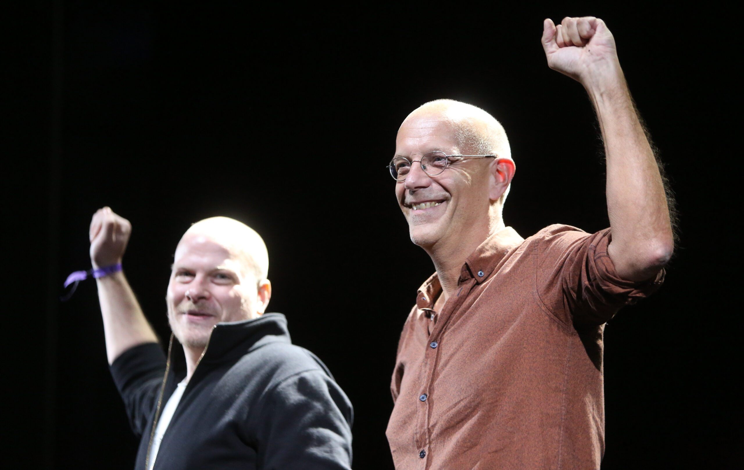 Cette joie, je trouve qu'on la retrouve sur la photo ci-dessous, prise à l'issue de la performance Sad by Design9 réalisée par Geert Lovink avec le musicien John Longwalker en 2020. Un souvenir immense pour Geert : "La dernière fois que j’ai vu Bernard, c’était à Berlin, lors de la Transmediale 2020, quelques semaines avant le confinement, quelques mois avant son départ... Il y avait donné une conférence, et j’y avais présenté ma performance Sad by Design, très influencée par son travail et notre collaboration. C’était sa dernière apparition publique. J’y lisais le texte d’un nouvel essai que j’avais écrit en France à l’été 2018. Bernard avait assisté à la performance et nous en avions discuté ensuite. J’étais très fier qu’il soit dans la salle. C’était dans un lieu mémorable, le Brecht-Theater, place du Luxembourg. Un des grands moments de ma carrière."